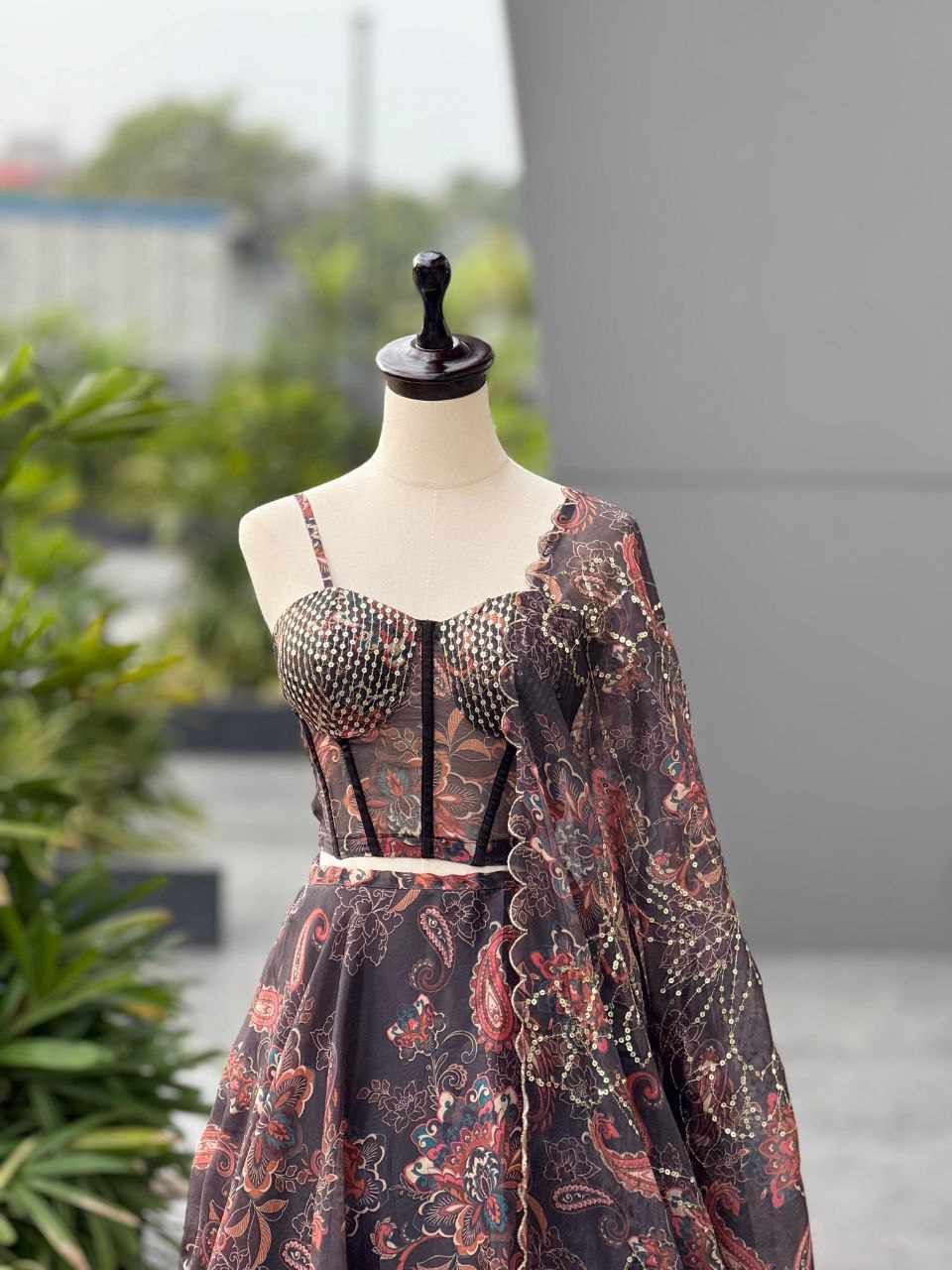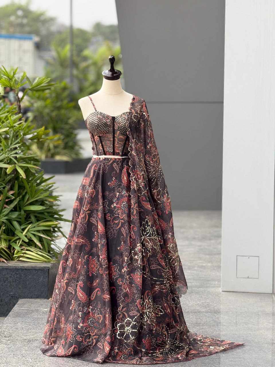 Lehenga – Pure Jimmy Organza digital printed lehenga with a grand 8-meter flair. Comes with canvas patta, can-can, and adjustable waist dori for a perfect fit